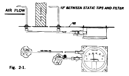 The type of static pressure tips used and their location is of primary importance in securing reliable readings. For maximum accuracy, it is essential that the influence of the velocity of the air be eliminated to permit sensing the true static pressure. Note that some filter installations do not provide a straight duct approach to the filter bank which may cause air to swirl and eddy.